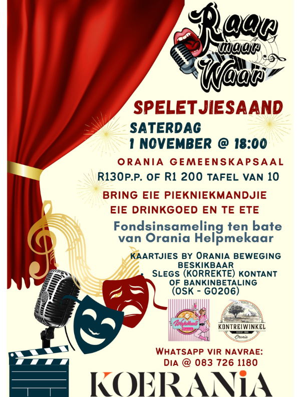 Kontak gerus die bestuur indien u ‘n lid van die klub wil word of ń bydrae wil maak om die rolbalbaan se afronding ‘n hupstoot te gee. OSK rekening: ORANIA ROLBALKLUB – GO 019
