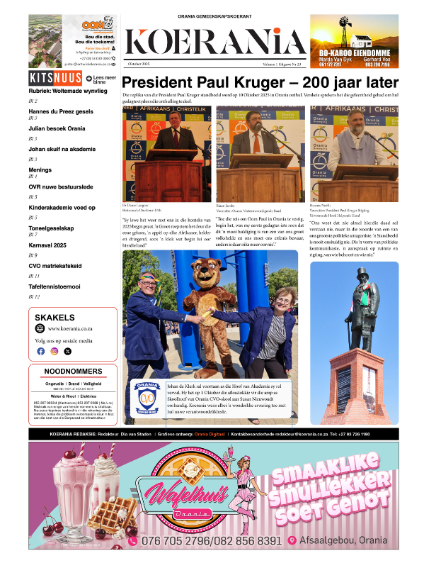 Die replika van die President Paul Kruger standbeeld word op 10 Oktober 2025 in Orania onthul. Verskeie sprekers het die geleentheid gehad om hul gedagtes tydens die onthulling te deel.